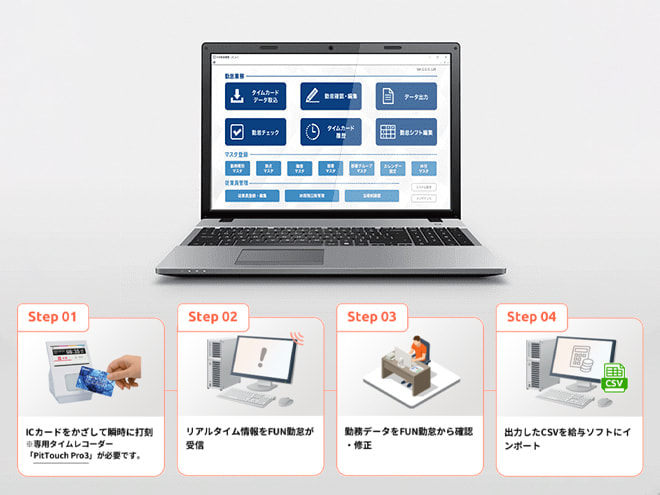 働き方改革での改正労基法にも対応したチェック機能。リアルタイムに自動集計したデータをCSV連携で各種給与ソフトへのデータ取り込みも行えます。